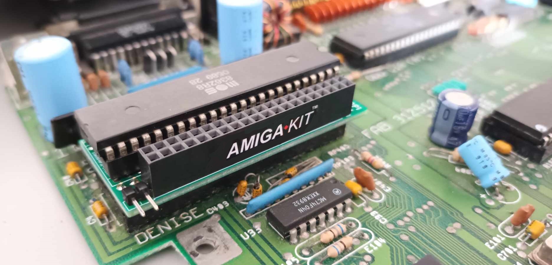 This adapter is plugged into the Denise socket on the Amiga 500 motherboard and in turn the Denise chip is piggybacked into the