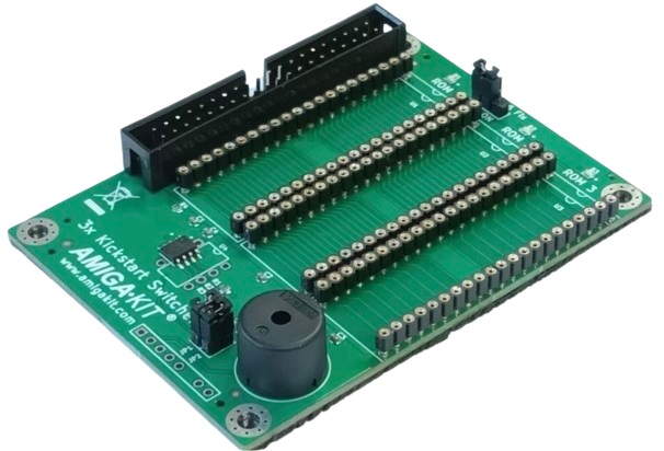 Accepts either two or three Kickstart ROMs (not included). Connects to original Kickstart ROM socket on motherboard by plugging in the attached plug-mounted ribbon cable (installation).